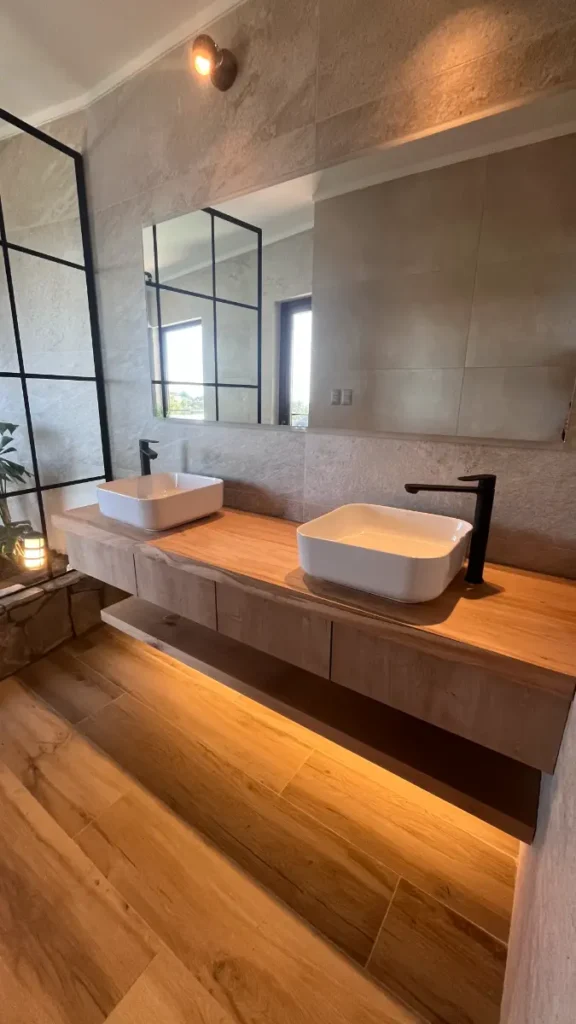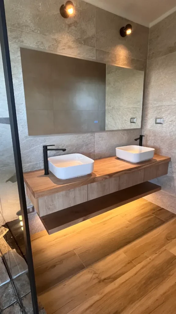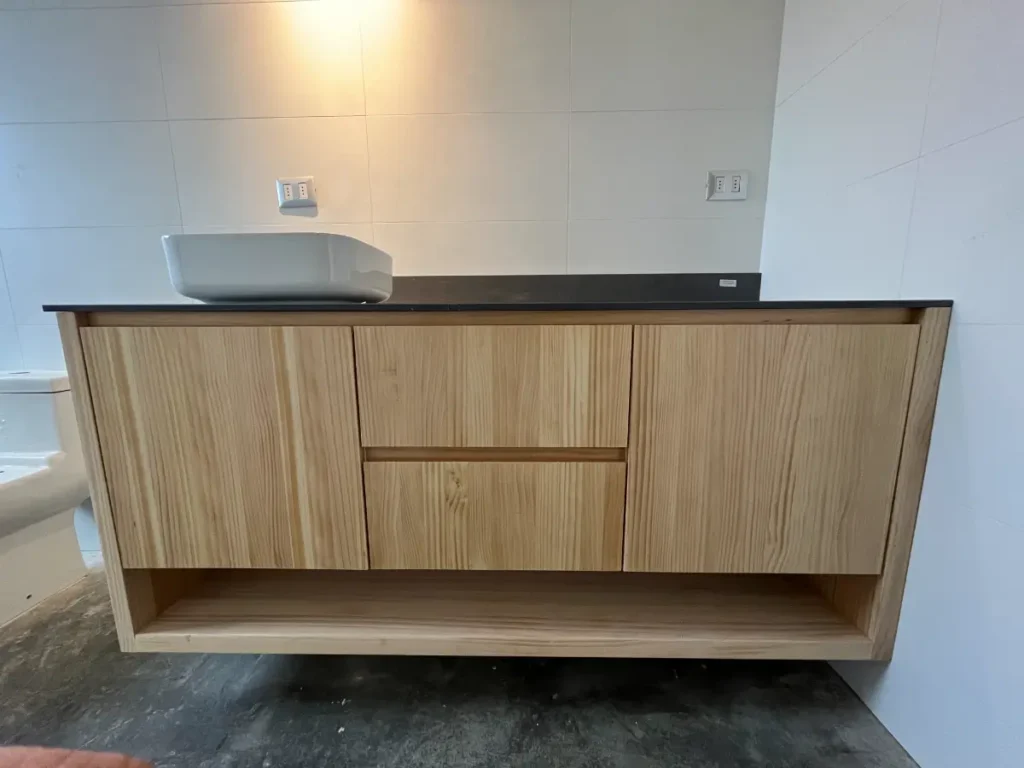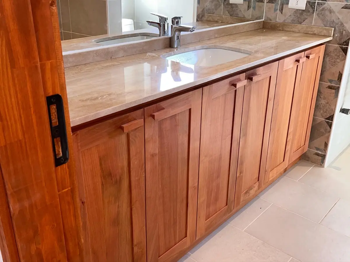 Creamos vanitorios, gabinetes y muebles de baño personalizados con maderas tratadas especialmente y acabados resistentes a la humedad.