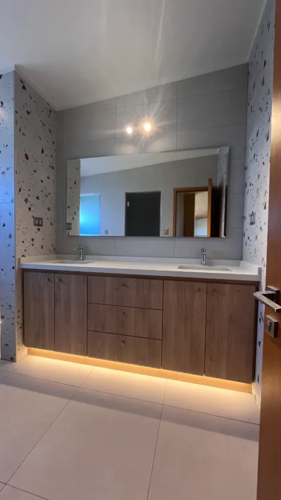 El baño merece la misma atención al detalle que cualquier otro espacio de tu hogar. En DeRoá diseñamos muebles de baño que combinan funcionalidad y estética, utilizando maderas especialmente tratadas y acabados resistentes que soportan perfectamente las condiciones de humedad.