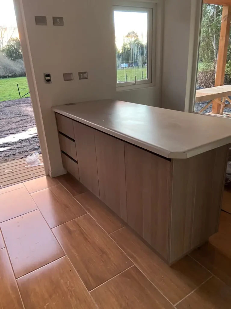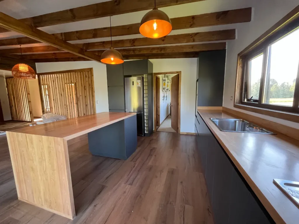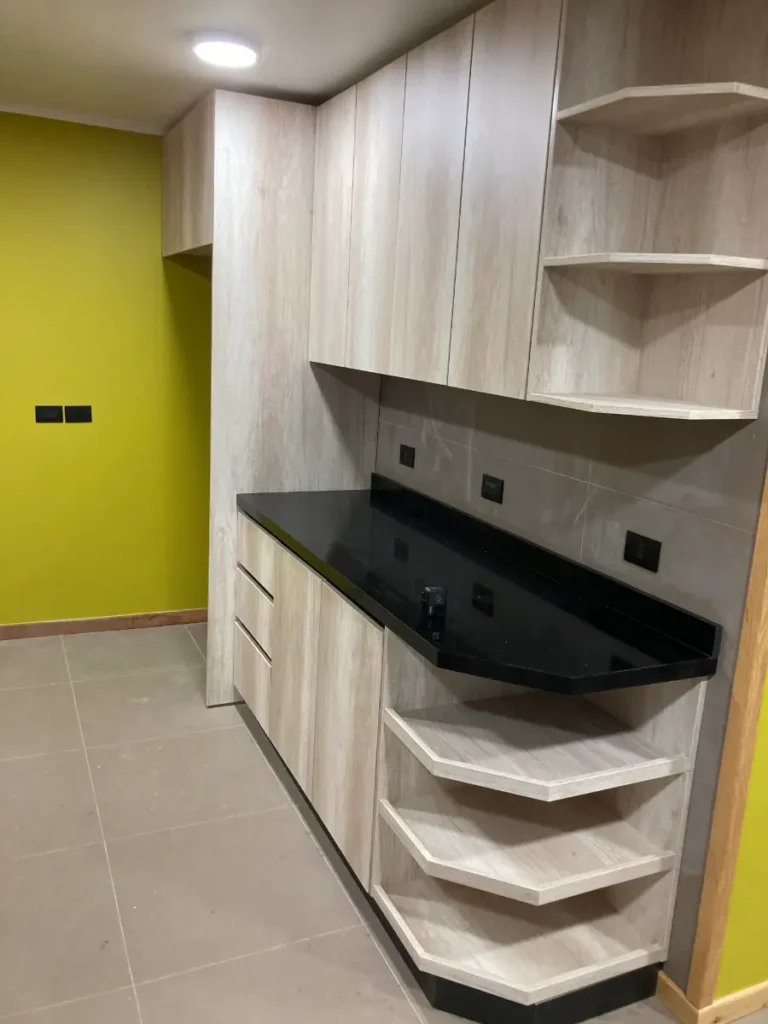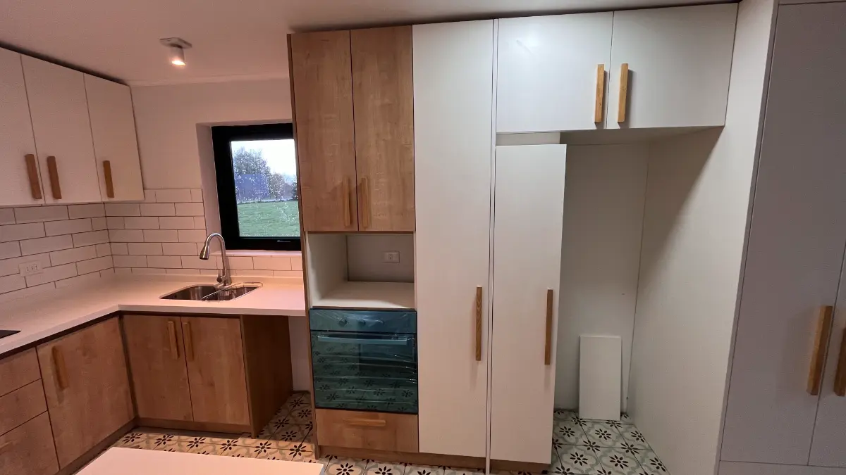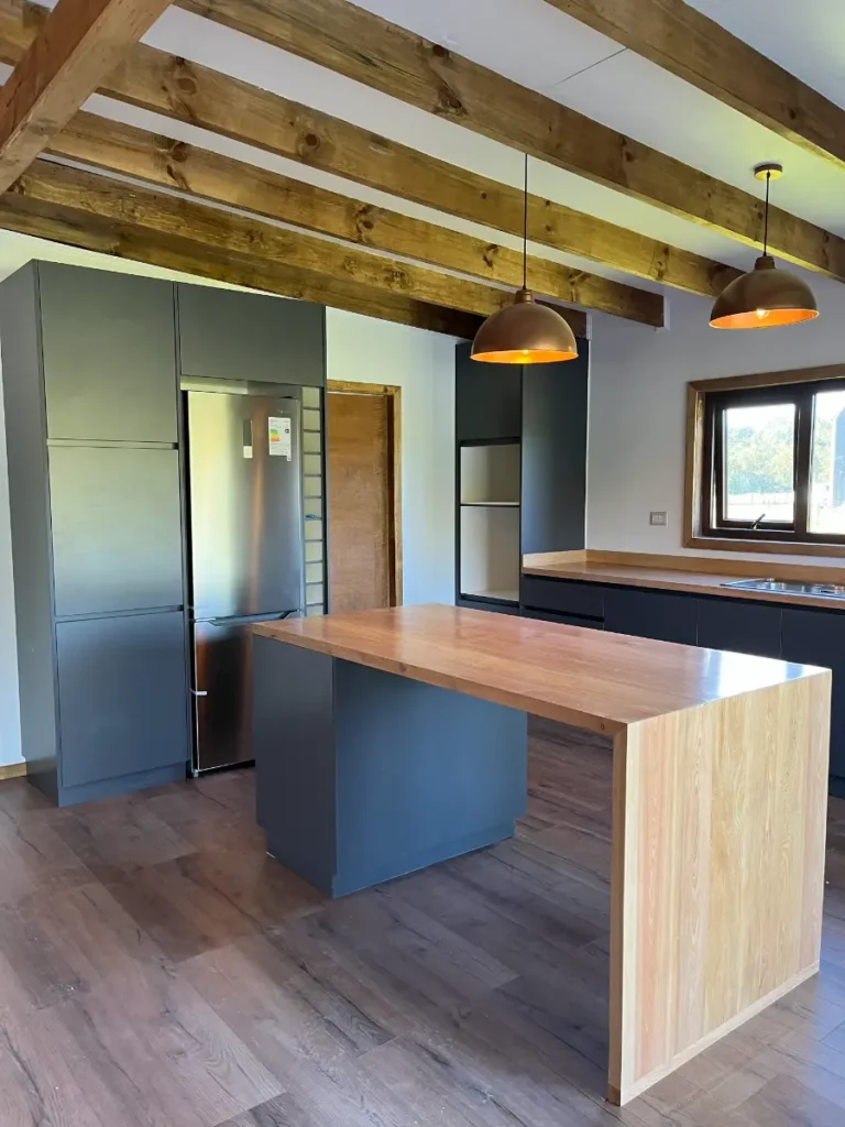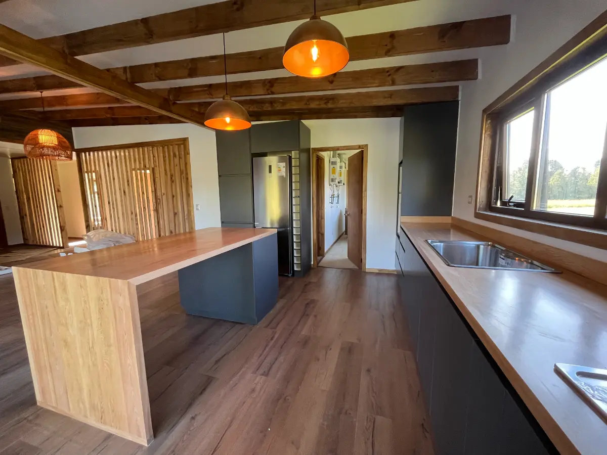 Nos especializamos en proyectos únicos. Si tienes una cocina pequeña en departamento o un espacio amplio con vista al lago, sabemos cómo aprovechar cada centímetro. Usamos maderas que resisten bien la humedad de nuestra región, con terminaciones prolijas y ese toque cálido que solo da la madera verdadera. El resultado es una cocina hecha especialmente para ti y tu familia.